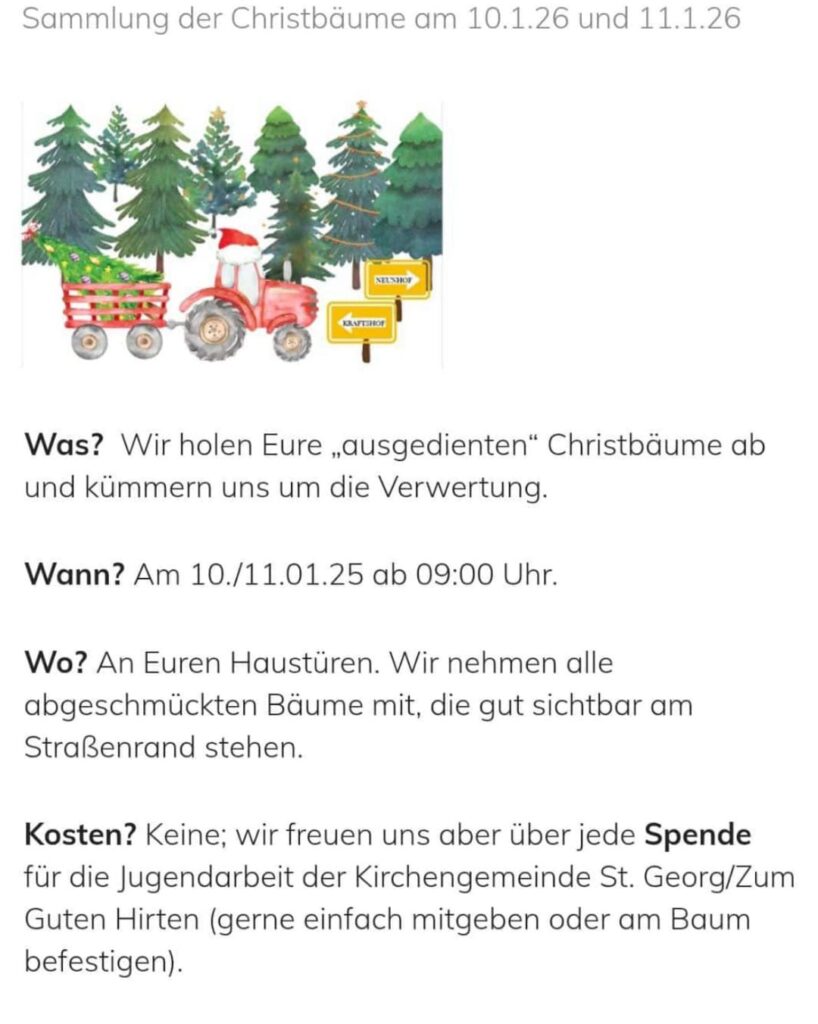 Christbaumsammlung 2026 Beitrags-Autor:Thomas Koerber Beitrag veröffentlicht:6. Januar 2026 Beitrags-Kategorie:Beiträge Beitrags-Kommentare:0 Kommentare Das könnte dir auch gefallen Kehrd wärd am 25.03.2023 ABGESAGT 18. März 2023 Kehrd wärd am 09.09.2023 7. September 2023 Gießkannenwagen verschwunden 4. Oktober 2023 Schreibe einen Kommentar Antwort abbrechenKommentierenGib deinen Namen oder Benutzernamen zum Kommentieren ein Gib deine E-Mail-Adresse zum Kommentieren ein Gib deine Website-URL ein (optional) Meinen Namen, meine E-Mail-Adresse und meine Website in diesem Browser für die nächste Kommentierung speichern.