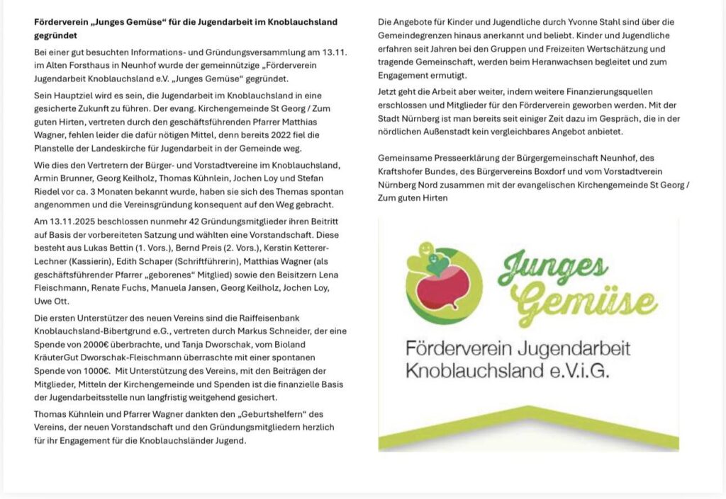 Bei einer gut besuchten Informations- und Gründungsversammlung am 13.11. im Alten Forsthaus in Neunhof wurde der gemeinnützige „Förderverein Jugendarbeit Knoblauchsland e.V. „Junges Gemüse“ gegründet. Sein Hauptziel wird es sein, die Jugendarbeit im Knoblauchsland in eine gesicherte Zukunft zu führen.