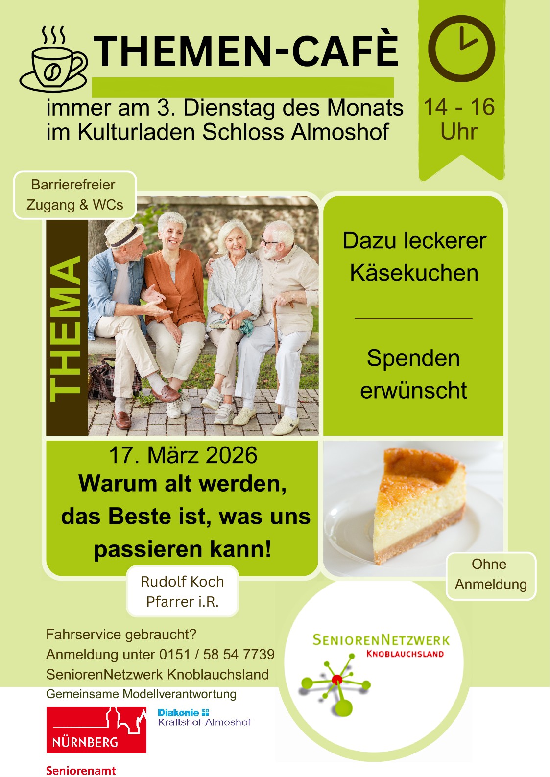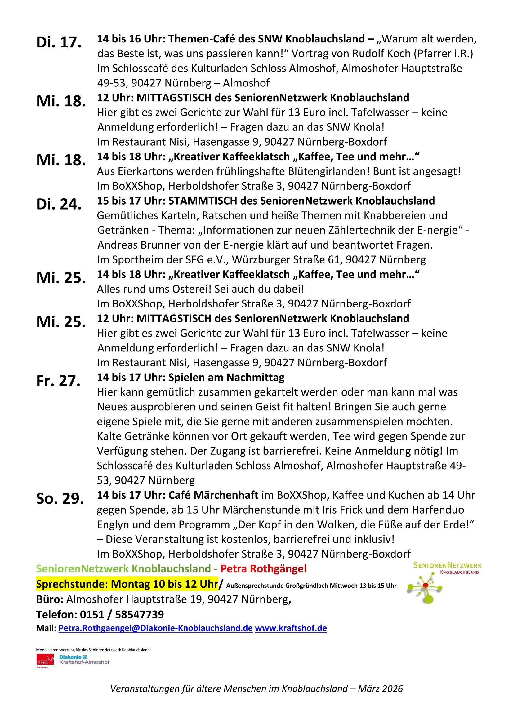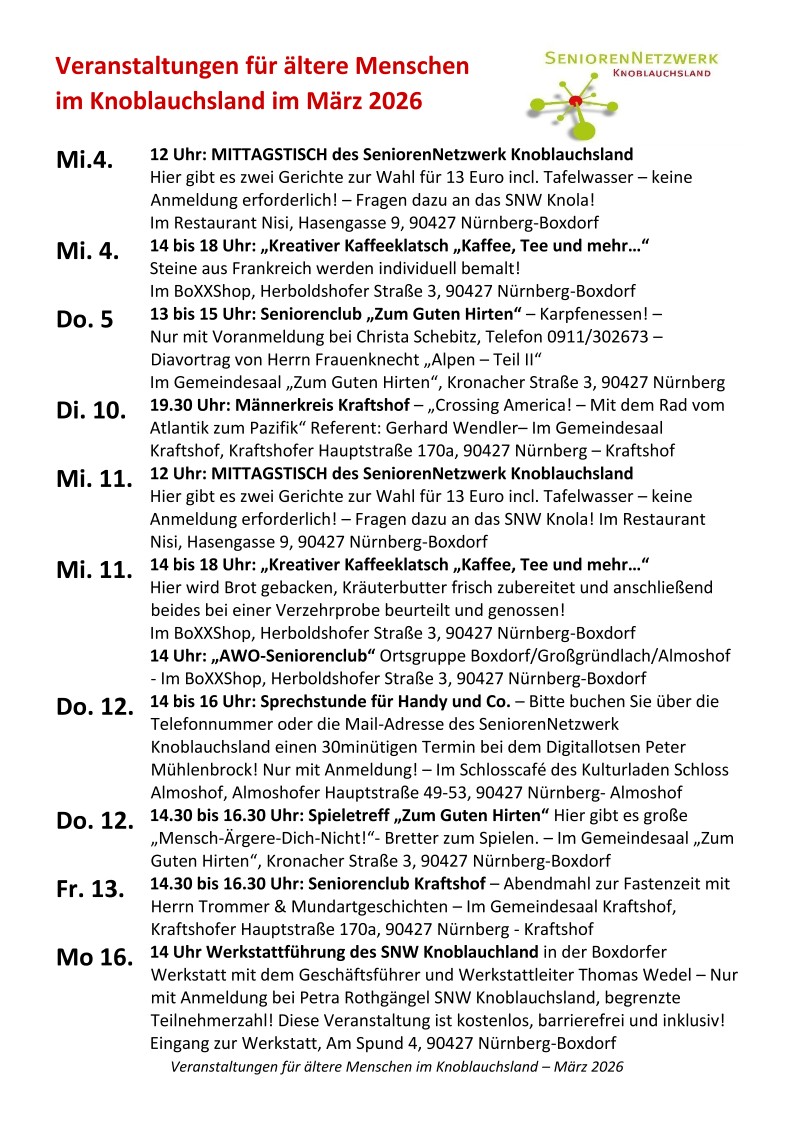 Veranstaltungen für ältere Menschen im Knoblauchsland im März 2026 Beitrags-Autor:Thomas Koerber Beitrag veröffentlicht:1. März 2026 Beitrags-Kategorie:Beiträge Beitrags-Kommentare:0 Kommentare Das könnte dir auch gefallen Termintipp: Kleinfeldfußballturnier der Kirchweihburschen in Kraftshof 16. Mai 2025 Termine und Informationen Seniorennetzwerk Knoblauchsland Oktober 2025 5. Oktober 2025 Kehrd wärd am 09.09.2023 7. September 2023 Schreibe einen Kommentar Antwort abbrechenKommentierenGib deinen Namen oder Benutzernamen zum Kommentieren ein Gib deine E-Mail-Adresse zum Kommentieren ein Gib deine Website-URL ein (optional) Meinen Namen, meine E-Mail-Adresse und meine Website in diesem Browser für die nächste Kommentierung speichern.